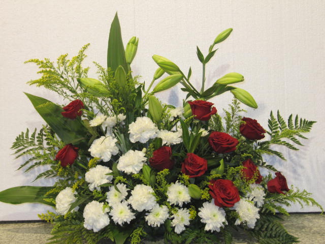 Rangkaian bunga krisan putih dan mawar merah